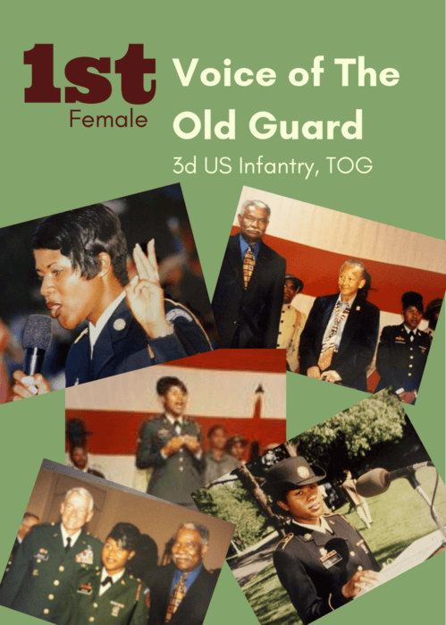 The 1st female to serve as "The Voice" of the 3d US Infantry, The Old Guard, which is the Presidential Honor Guard, stationed in Ft. Myer, Virginia and Guardian of The Tomb of The Unknown Soldier as well as Tour Guides to the Pentagon and White House. That's a long story, see about me section and read the book for more.